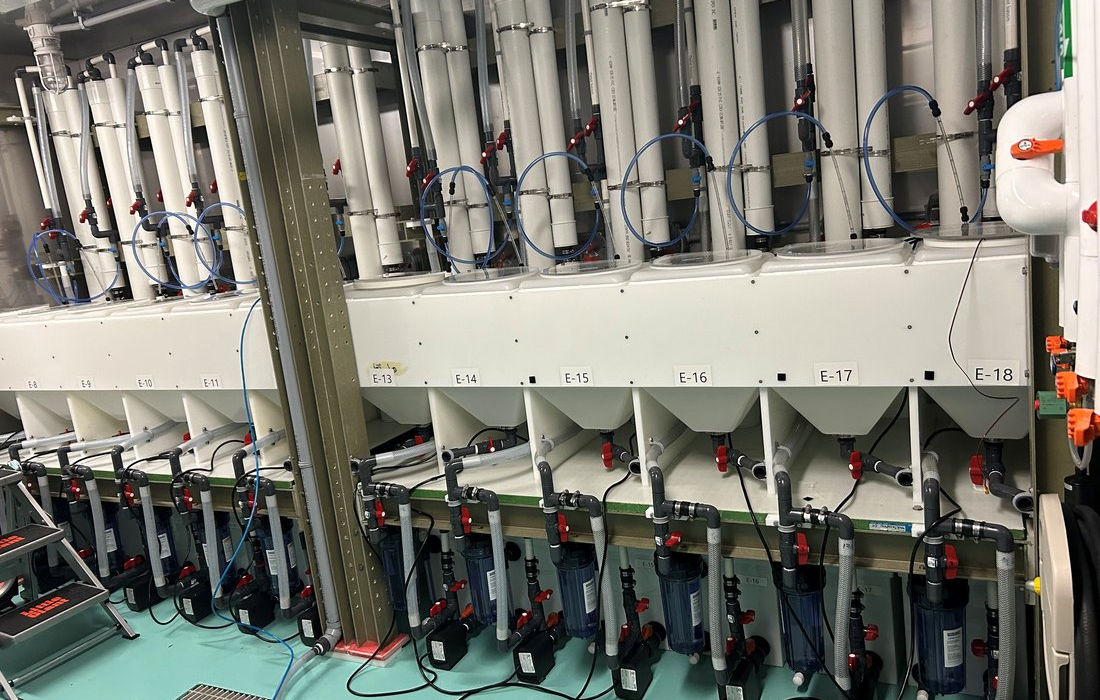2 salles d’hébergement localisées dans des chambres réfrigérées et comportant chacune 18 bassins et systèmes de filtration indépendants (18 petites unités d’hébergement)